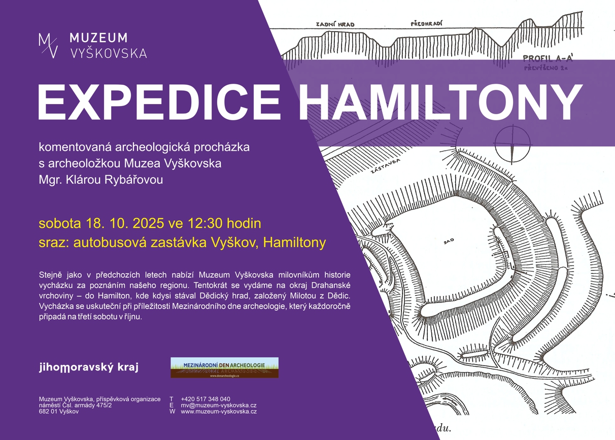 Stejně jako v předchozích letech nabízí Muzeum Vyškovska milovníkům historie vycházku za poznáním našeho regionu. Tentokrát se vydáme na okraj Drahanské vrchoviny – do Hamilton, kde kdysi stával Dědický hrad, založený Milotou z Dědic.  Vycházka se uskuteční při příležitosti Mezinárodního dne archeologie, který každoročně připadá na třetí sobotu v říjnu.