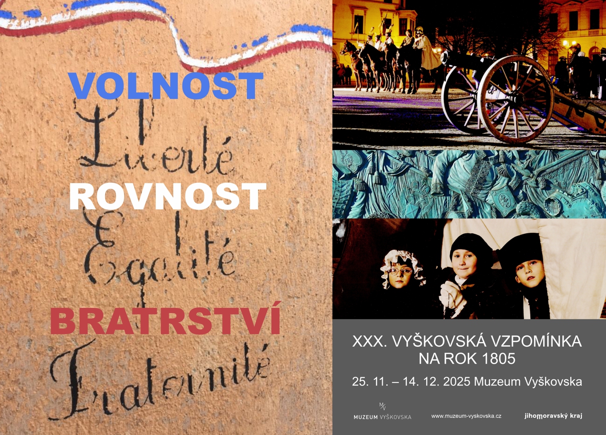 Přijďte vzpomenout na události roku 1805 ve Vyškově i jejich třicátou připomínku do Muzea Vyškovska. Očekávat Vás budou originální dobové předměty i různé doklady ze tří dekád vzpomínkových akcí – fotografie, plakáty, uniformy, vyznamenání, mince. Doklady zájmu, píle a entuziasmu lidí, s pokorou osobně připomínajících tyto dávné události.