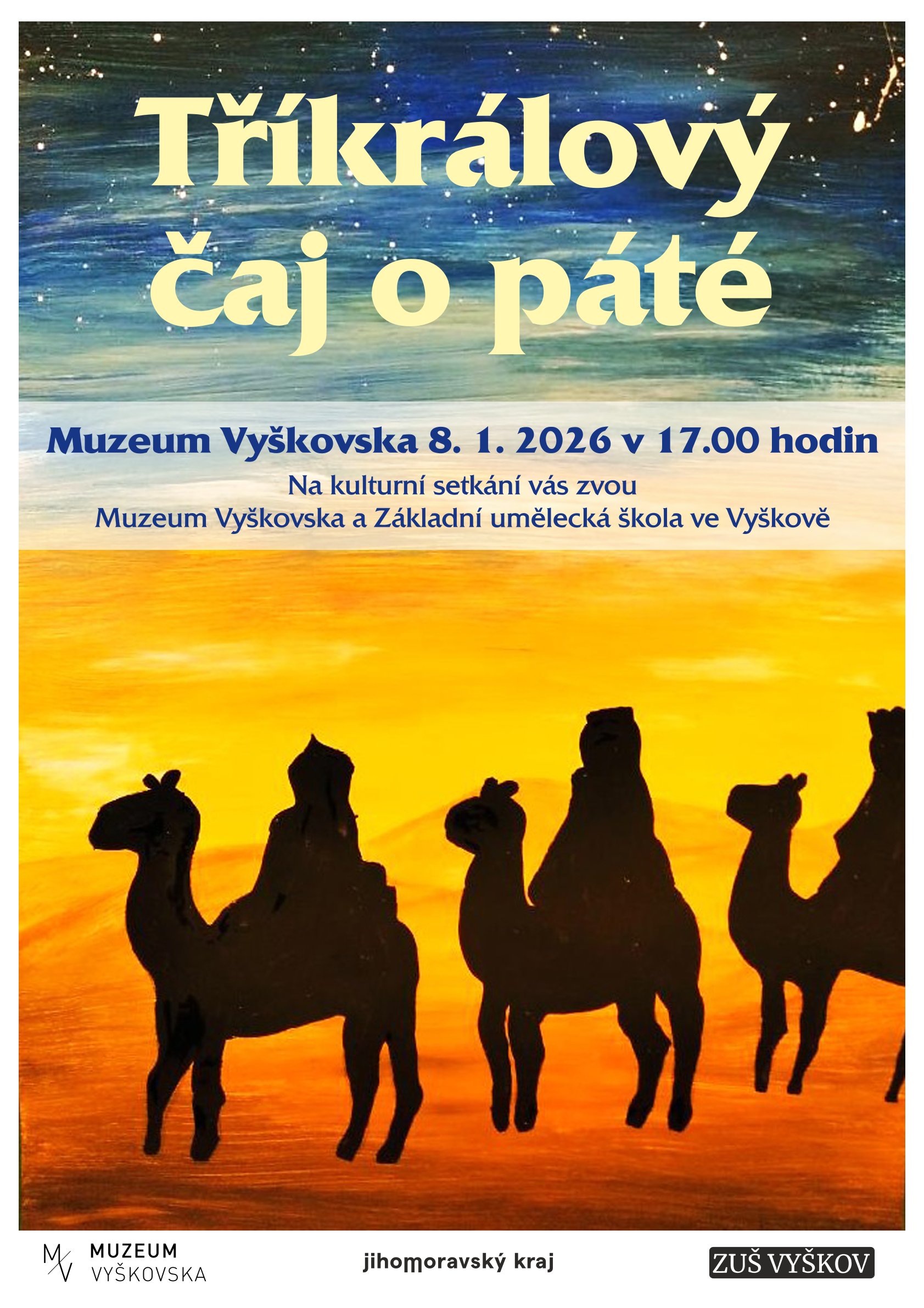 Až do 14. ledna 2026 mohou zájemci zdarma navštívit tematickou výstavu výtvarných prací žáků ZUŠ Vyškov, doplněnou o dobové předměty vztahující k čajovým dýchánkům a případně přispět drobným příspěvkem do pokladničky v rámci Tříkrálové sbírky na charitativní účely.