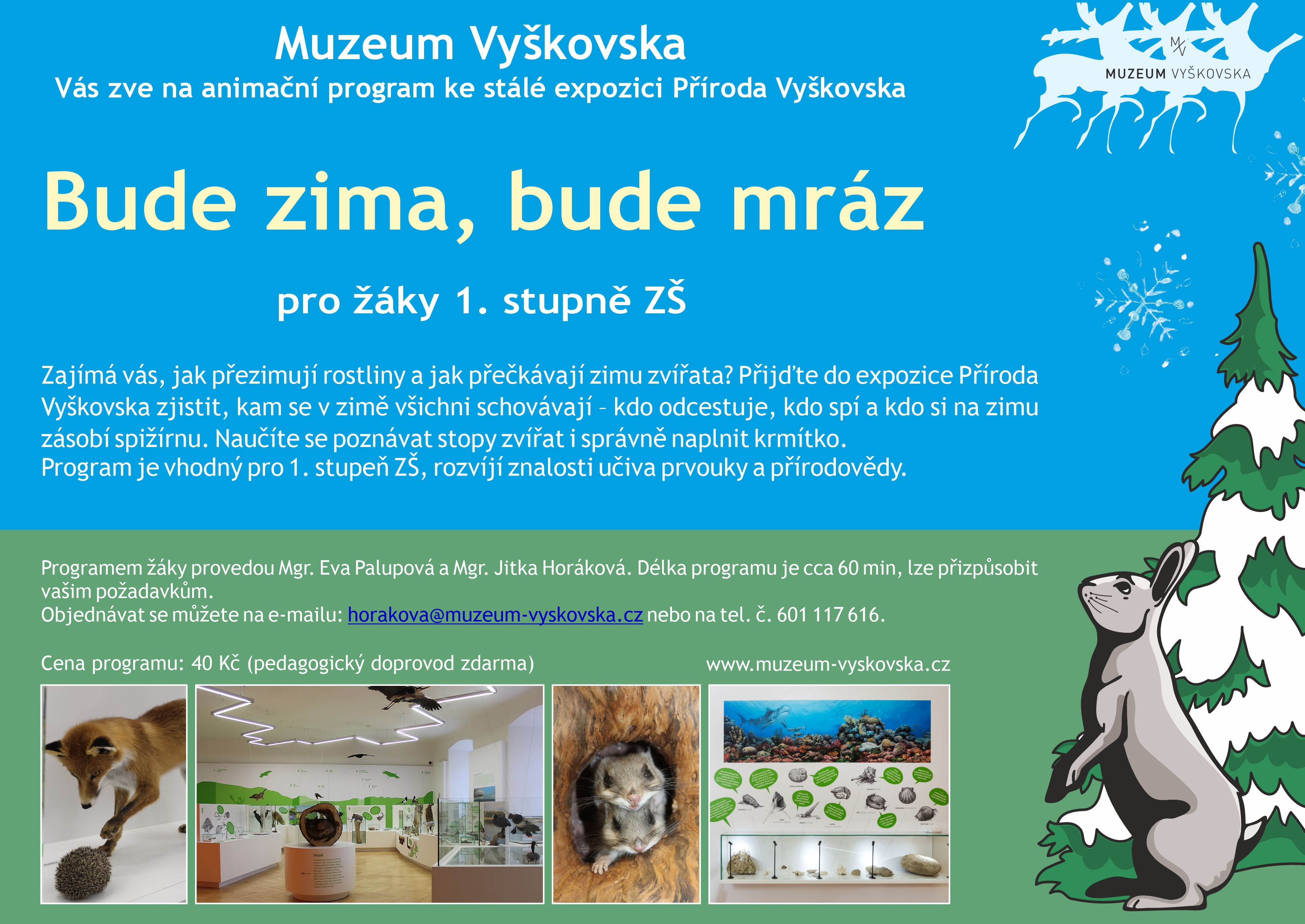 Zajímá Vás, jak přezimují rostliny a jak přečkávají zimu zvířata? Přijďte do expozice Příroda Vyškovska zjistit, kam se v zimě všichni schovávají – kdo odcestuje, kdo spí a kdo si na zimu zásobí spižírnu. Naučíte se poznávat stopy zvířat i správně naplnit krmítko. Program je vhodný pro 1. stupeň ZŠ, rozvíjí znalosti učiva prvouky a přírodovědy.
