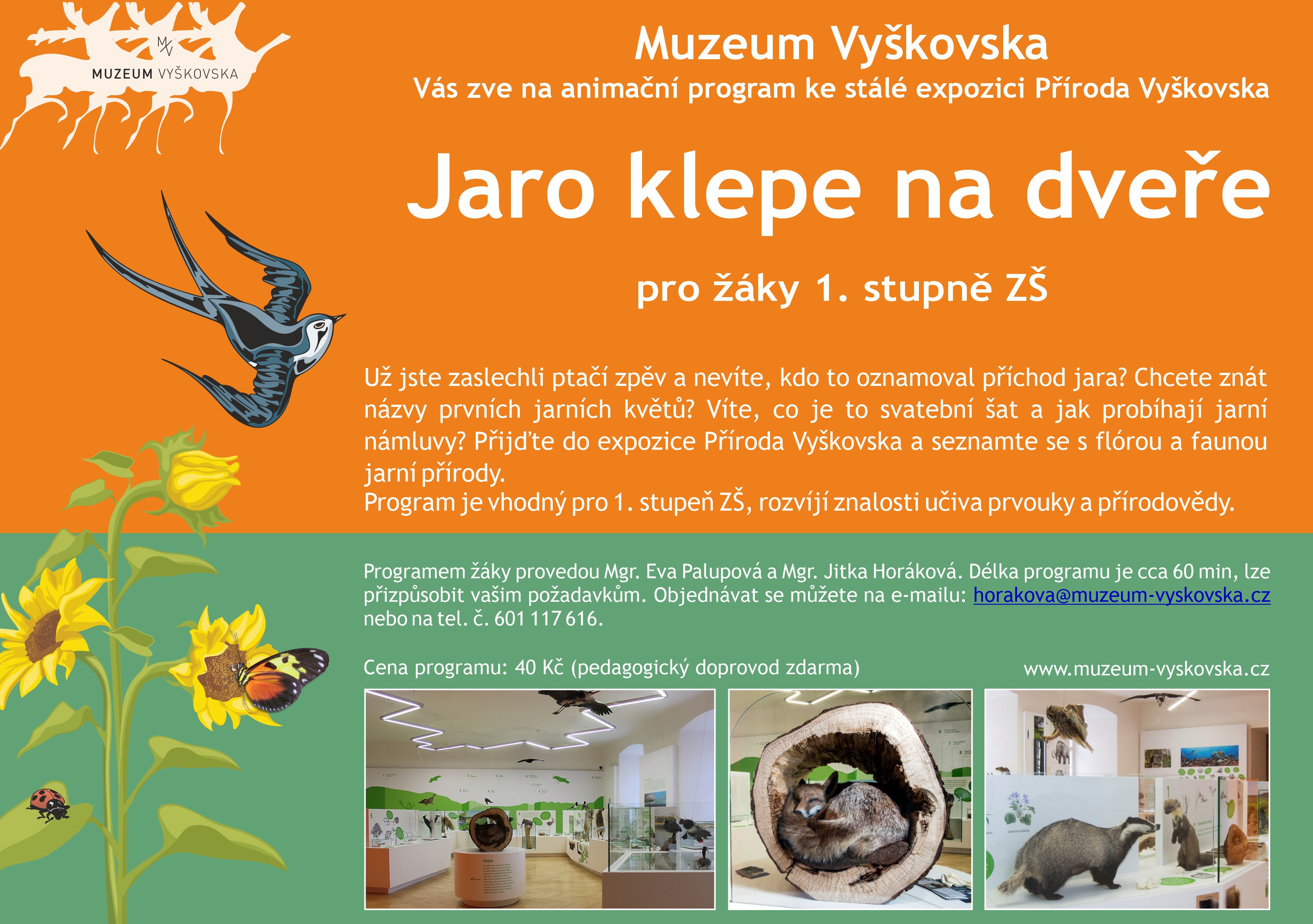 Už jste zaslechli ptačí zpěv a nevíte, kdo to oznamoval příchod jara? Chcete znát názvy prvních jarních květů? Víte, co je to svatební šat a jak probíhají jarní námluvy? Přijďte do expozice Příroda Vyškovska a seznamte se s flórou a faunou jarní přírody. Program je vhodný pro 1. stupeň ZŠ, rozvíjí znalosti učiva prvouky a přírodovědy.