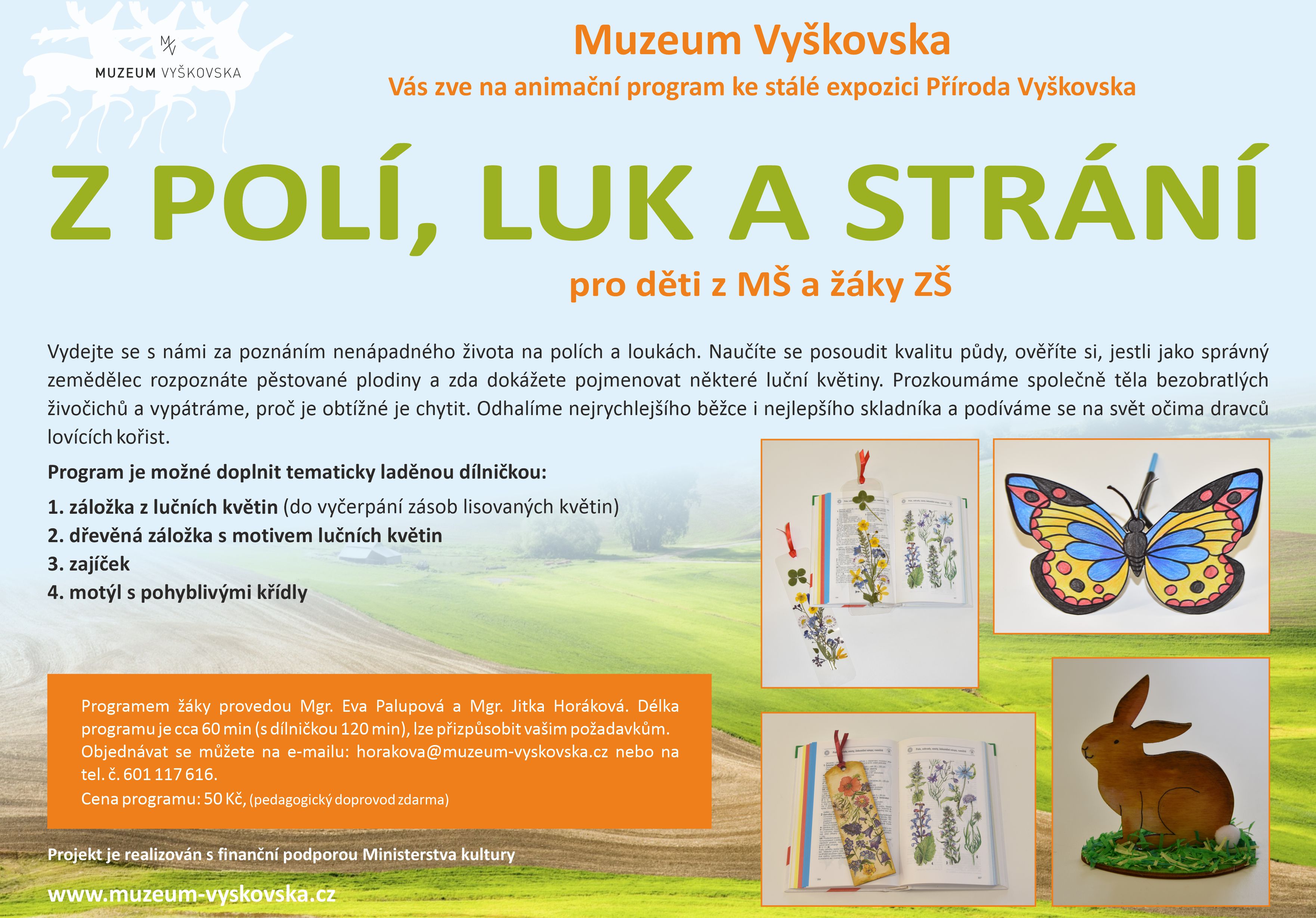 Programem žáky provedou Mgr. Eva Palupová a Mgr. Jitka Horáková. Délka programu je cca 60 min (s dílničkou 90 min), lze přizpůsobit vašim požadavkům. Objednávat se můžete na e-mailu: horakova@muzeum-vyskovska.cz nebo na tel. 601 117 616.