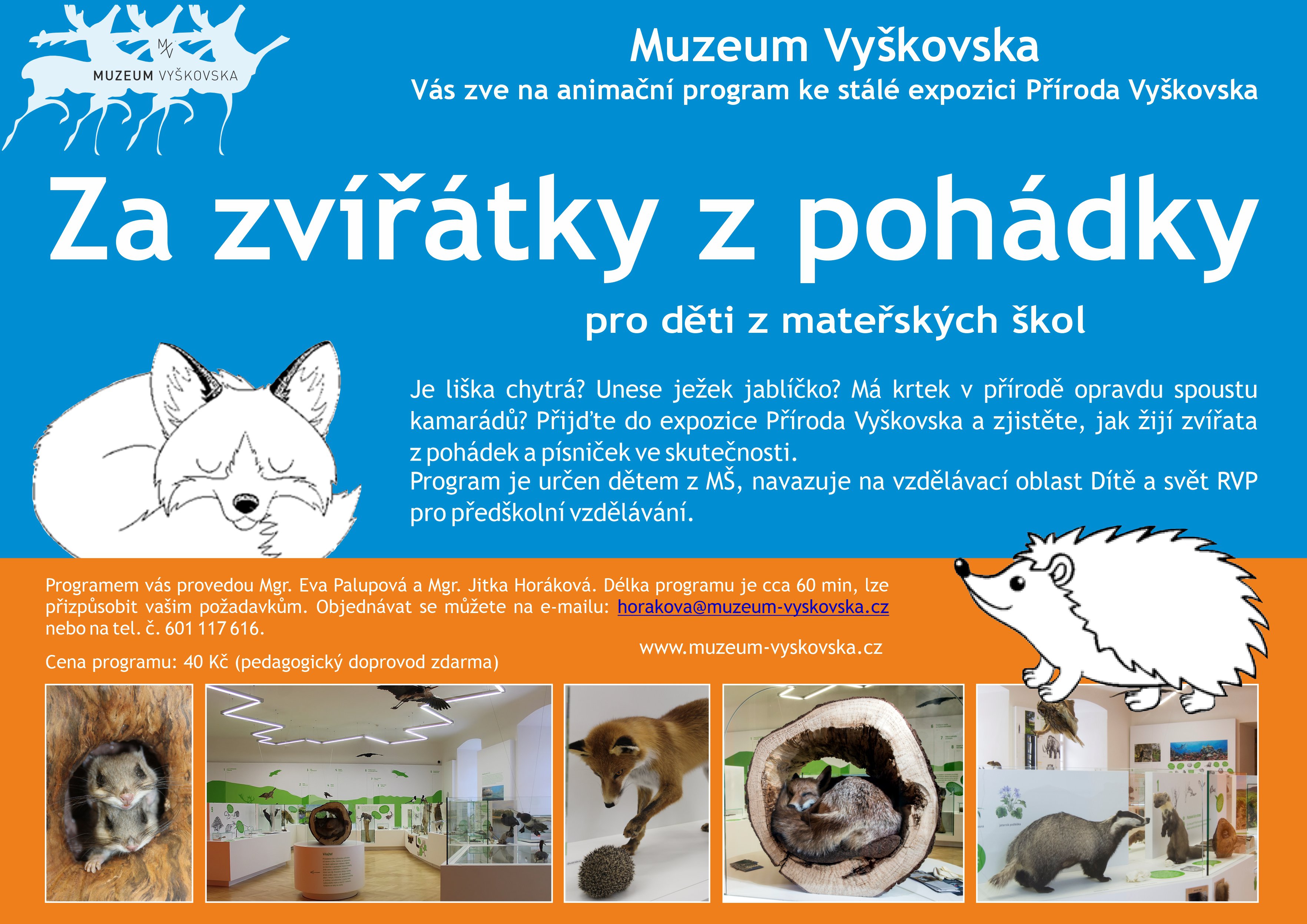 Je liška chytrá? Unese ježek jablíčko? Má krtek v přírodě opravdu spoustu kamarádů? Přijďte do expozice Příroda Vyškovska a zjistěte, jak žijí zvířata z pohádek a písniček ve skutečnosti. Program je určen dětem z MŠ, navazuje na vzdělávací oblast Dítě a svět RVP pro předškolní vzdělávání.